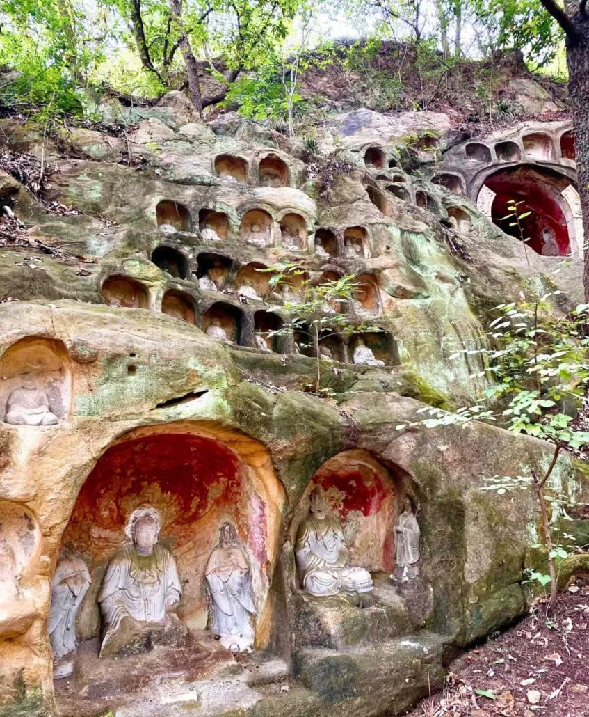 栖霞山不仅以红叶闻名,更是一座蕴藏千年文明的艺术宝库。在登山途中,师生们重点考察了千佛岩——这一南朝石刻艺术瑰宝。石窟中佛像栩栩如生,形制各异,见证了中国佛教艺术的发展与演变。大家在导览讲解中了解到,千佛岩历经朝代更迭,融合了不同时期的雕刻风格,是研究中国古代宗教、艺术与社会变迁的重要实物资料。职工们在此不仅观赏到精湛的石刻技艺,更感受到中华文化中“刻石铭心、传承不息”的精神底蕴。